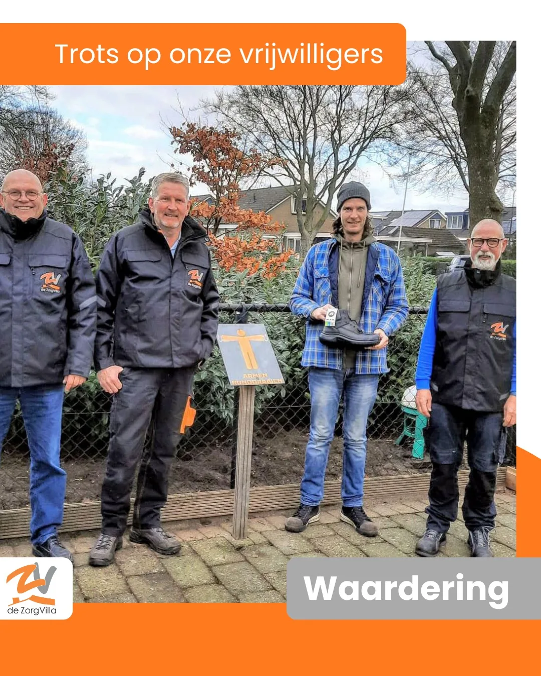 Wat zijn wij trots op onze vrijwilligers! Mensen die zich inzetten voor onze lieve bewoners en onze mooie woonlocatie. De een als tuinman om te zorgen dat de tuin aantrekkelijk blijft voor een fijne wandeling en zorgen dat het terrein netjes blijft. Een ander die als trouw maatje wekelijks een van onze bewoners bezoekt. Weer een ander die ondersteunt bij de borrelmiddag, de bingo, het ‘samen in gesprek’, het winkeluitje of creatieve activiteiten. Velen die ondersteunen in de huiskamers om de koffie en lunch te verzorgen. Wandelaars die ondersteunen bij de georganiseerde wandelingen. Wat zijn we hen dankbaar. Want door hen kunnen we nog meer verschil maken in het leven van anderen. Hun liefdevolle aandacht draagt zó bij aan het fysieke en mentale welzijn van onze bewoners. Als blijk van waardering mochten de tuinvrijwilligers een mooie werkjas of werkschoenen uitkiezen. De andere vrijwilligers kregen een bodywarmer aangeboden. En dat dit wordt gewaardeerd kun je wel zien. Zo zorgen we voor elkaar. De ZorgZaak 🧡 Word vrijwilliger van de ZorgZaak